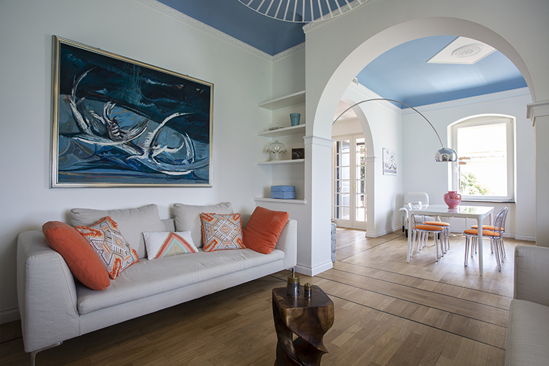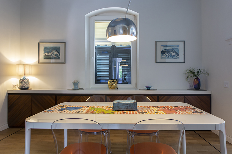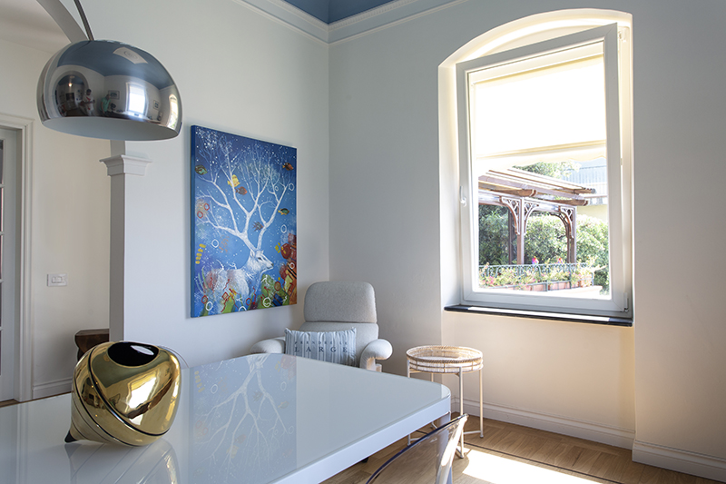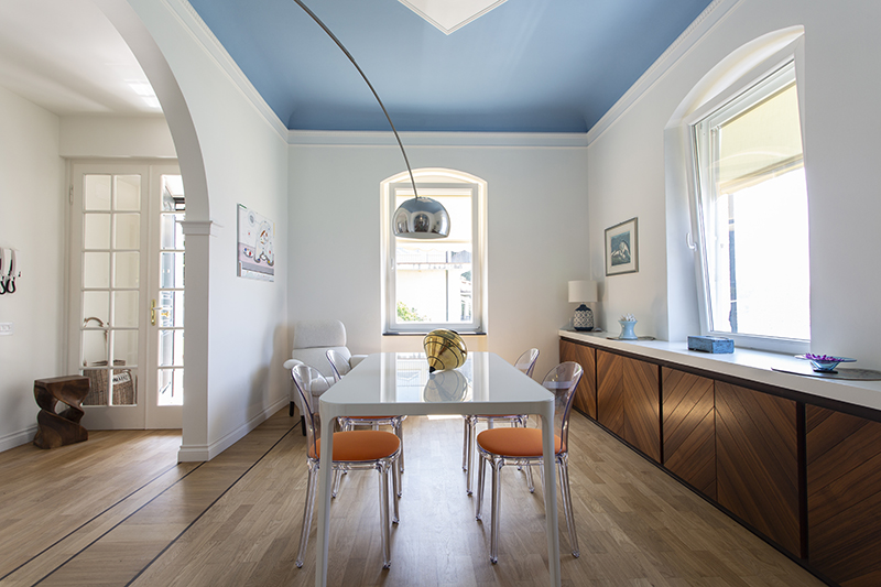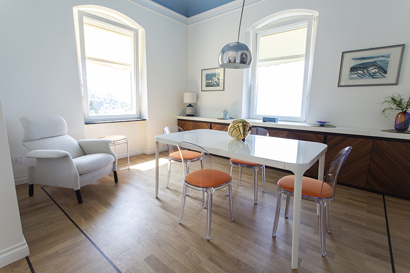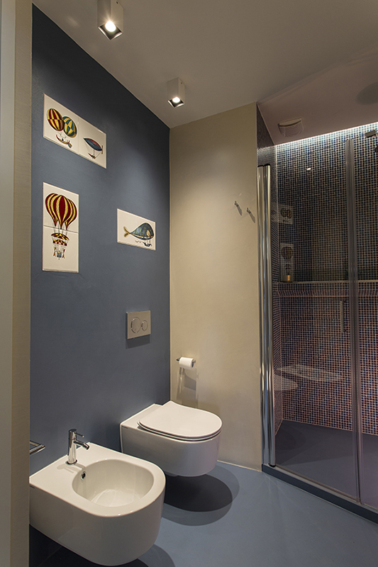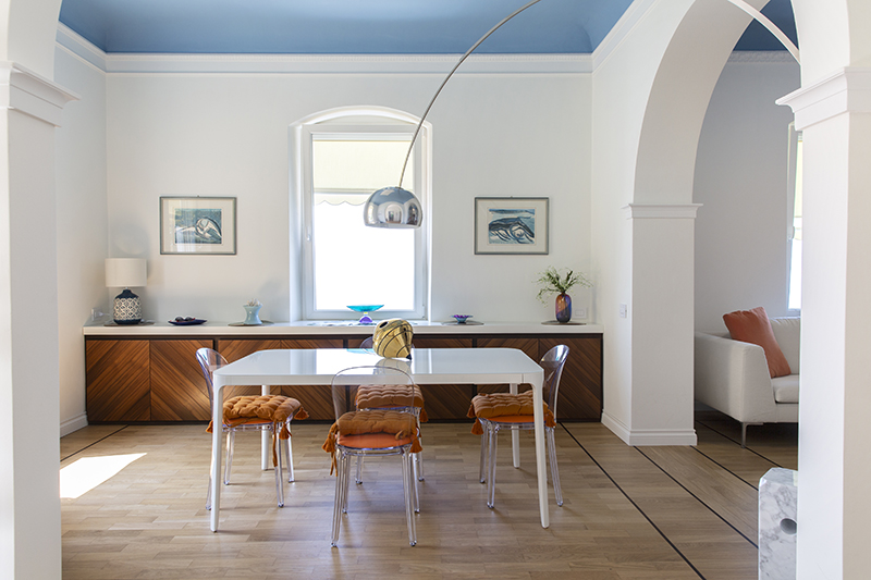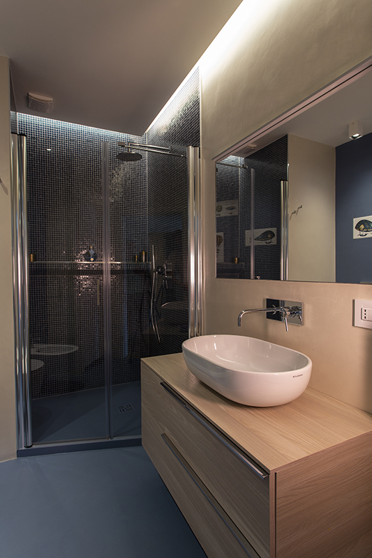The story behind this job is as special as the relationship between the owners and their beautiful home: love at first sight during a random visit to Lerici. The apartment is located at the top floor of an early twentieth century building; the flat and its wide terrace provide a breathtaking view that include on the whole Golfo dei Poeti and Portovenere. We access the flat through the big terrace-garden where an outdoor shower hidden under a tree and a wooden alcoved straucture where the owners love to spend summer nights togerther with their friends. The apartment, with free sight on all sides, is invaded by light and it is composed of a double living area that welcomes the guest as soon as he enters: the transitional dining area and the livingroom more reserved and intimate. Two bedrooms, two bathrooms and the kitchen complete the flat. All the living area and the master bedroom overlook Lerici's sea shore: a sequence of panoramic views impress the guest that might lean over. The interior design intervention has been conservative in order to give value and restore the original features of the property, updating its language with new materials and contemporary solutions. Keeping good contact with the owners has allowed us to make the most of all spaces through made to measure furniture pieces and wardrobes. The two bathrooms are characterized by the alternation of resin and gres porcellanato and mosaic: in the bathroom with shower as in the kitchen we inserted in the wall depth some 20x20 tiles, decorated with flying cars designed by Piero Fornasetti. The flooring of the living area and bedrooms have a traditional parquet, which have been recovered, while in the bathrooms we preferred realizing an eco-resin carpet. The sea and its colors are at the center of the whole project as a constant presence that measure the space of the home and the view that it is surrounded by.Photographer: Daniele Bianchi
