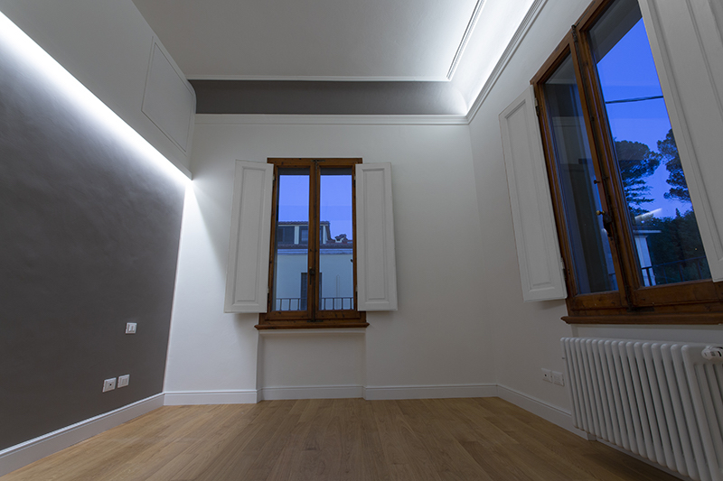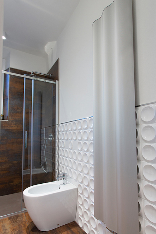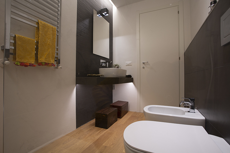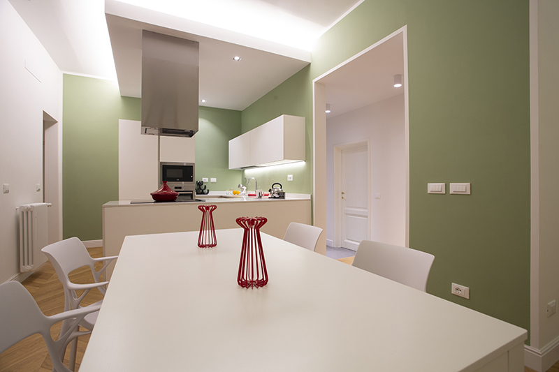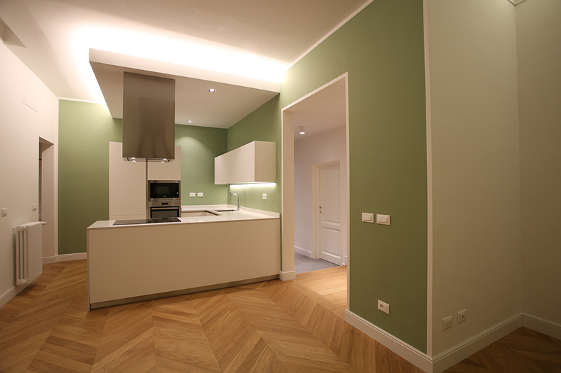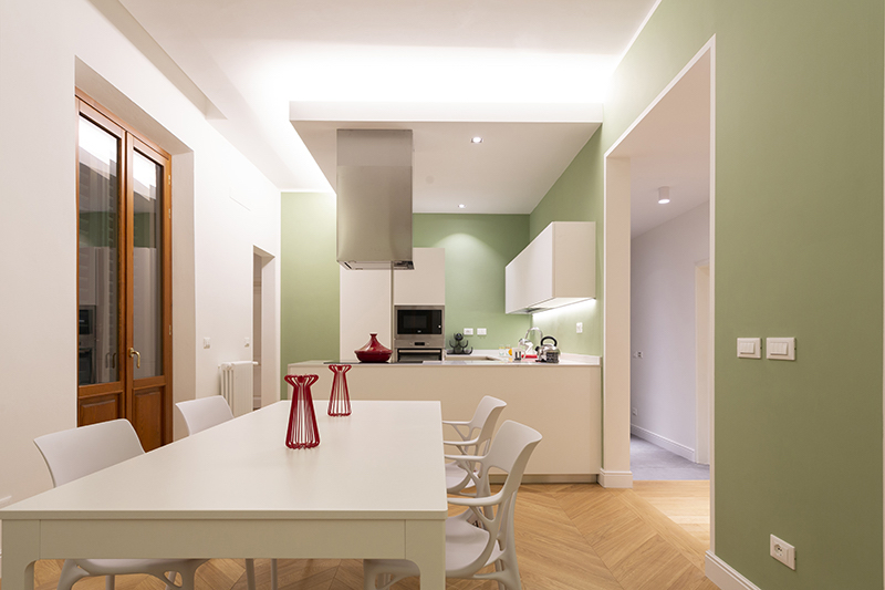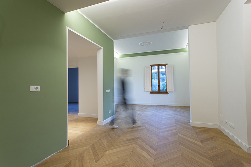 This airy and bright appartement is inhabited by a young couple and their little daughter. The idea behind the project started with the desire to reinterpret in current key the original planimetrical distribution of the house according with the specific needs of the new owners without distorting and deleting the typical features of the building of the early florentine twentieth century: we wanted to match chromatic and decorative choices of the construction period to modern solutions, both in the choice of some finishes and in the fournishing . The house consists of a large living area with an open kitchen, intended as the virtual center of the house and the heart of domestic life, three large rooms served by a bathroom, while entering the service area we find a guest bathroom, a storage and a loudry room. The kitchen is illuminated by a large glass door that overlooks a very special quarter-shaped terrace.From all the windows you can enjoy the view of the first Florentine hills and the nature that surrounds the house is re-proposed internally in the wall colors of the living area and in the choice of paving the whole house in oak parquet laid with a Hungarian plug or in running planks . The bathrooms stand out in finishes and in the choice of colors: the master one in shades of gray and black with a spectacular shower enclosure covered with large slabs of calacatta marble effect, while the one serving the living area characterized by white and rusty iron porcelain stoneware tiles on the floor and in the shower box. The careful lighting design creates different solutions for the rooms in the home. The harmony and the fruitful dialogue with the landlady have allowed us to deliver a renovated house, without denying the past but with a look to the future.Photographer: Daniele Bianchi