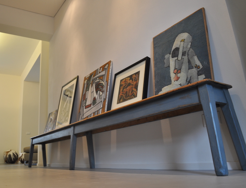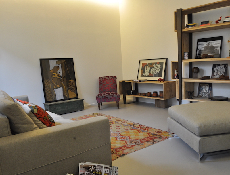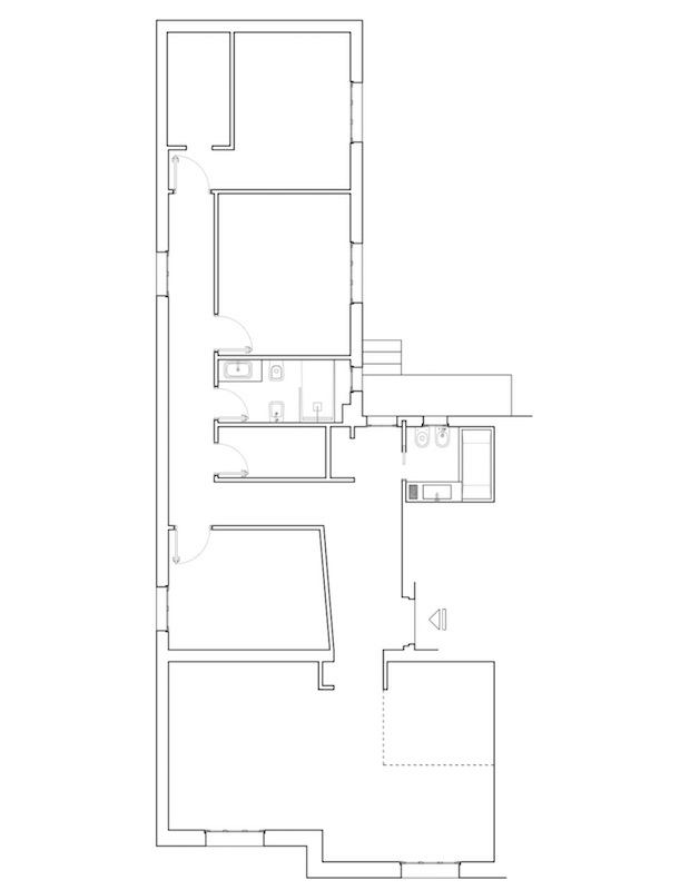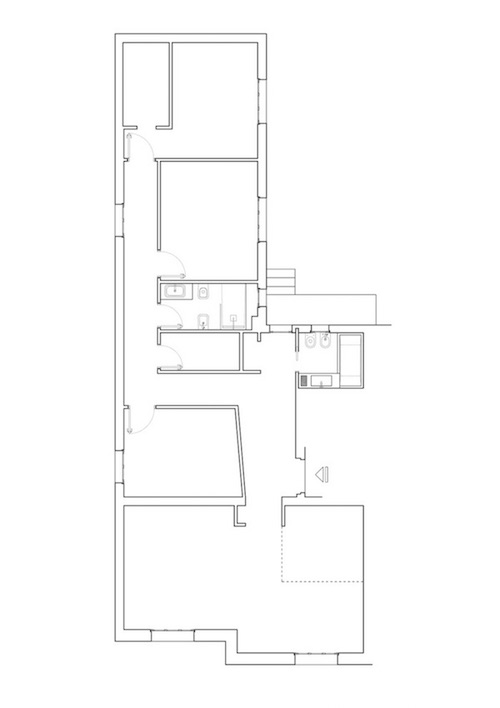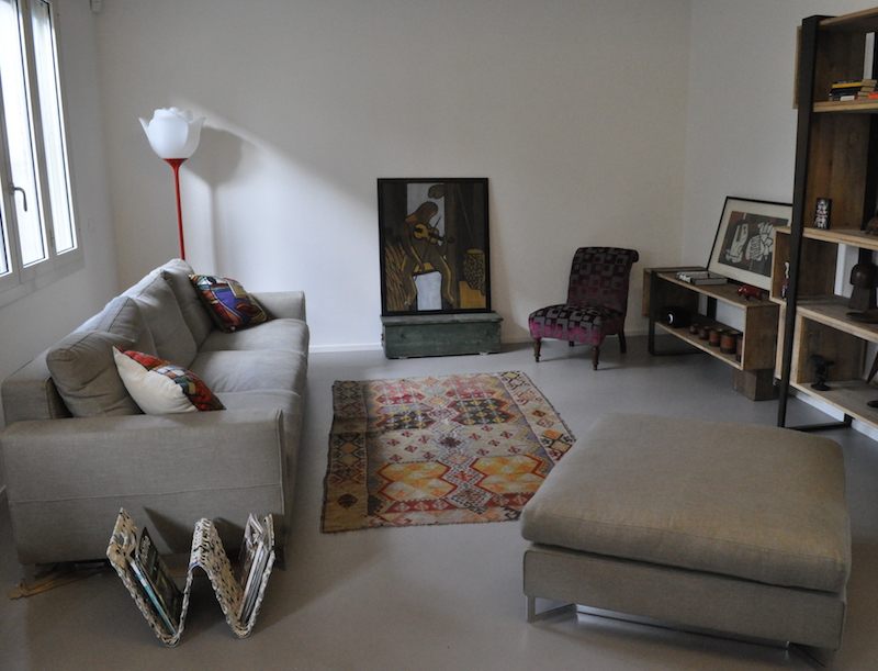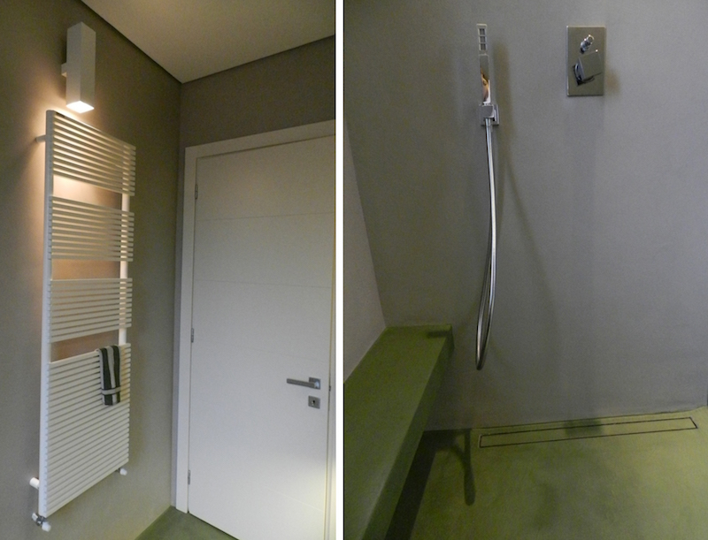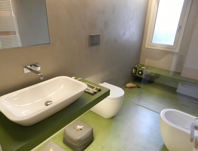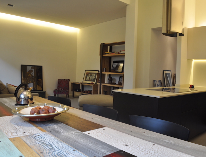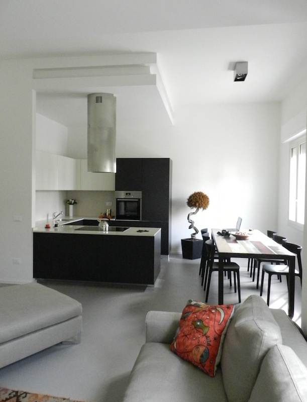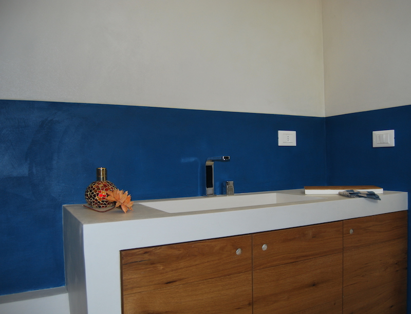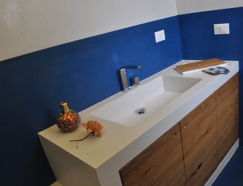 The apartment is located in one of Florence's most beautiful residential areas: the hills above Porta Romana and Poggio Imperiale. The property was in terrible conditions: an anonymous 50's apartment, big and visibly neglected, composed of an entrance hall facing the livingroom, a bedroom, a dinette-kitchen with access to the beautiful private garden; then following a long corridor that gave access to the remaining two rooms and to the only bathroom. Having a close relationship with the owners of the household, we immediately agreed to reinvent the space with a modern approach, creating fluid areas that would host the collection of artworks owned by the couple as a personal gallery where art pieces (RISCRIVERE LA FRASE IN ITALIANO PRIMA). The generous square footage – more than 120sqm net – conceeded to revoultion the arrangement asset, to add a second bathroom, and to create a wide open living space. Masonry backdrops, countertops, and well layed out furniture have defined the different space without visual barriers: the kitchen, the big dining table designed by the architect with recycled and assembled wooden floor planks of various essences as a patchwork, the livingroom. The floor is a one eco-resin “carpet”, single-component, of a neutral color that helps to celebrate the paintings, the vintage objects and the design pieces. Entering the flat, a slightly diagonal wall hosting several paintings generates a dynamic space that immediately divides the living from the more reserved areas of the apartment. A blue streaked resin backdrop conducts us to the night area, passing by a studio room, a block of services, then a bathroom and two bedrooms. The master bedroom is bare and intimate, thanks to walk-in closet that works as a filter and guarantees privacy withouth the need of doors. The wooden floor Pur Vintagein planks of 19cm characterizes all these spaces. The two bathrooms are fully coated in resin. The day-area bathroom has been conceived as a big blue tub, where the ceramic pieces emerge with their white colour. The sink and the bath-tub are built in resin-coated masonry and where designed by the architect. The night area bathroom is also two-colour and characterized by a big shower that occupies the end of the bathroom in its whole width and it is delimited by a wide crystal glass perfectly embedded to the wall and to the floor. A small sail coated in “corten effect” resin illuminates the space and unites visually the sink plane, the ceramic pieces, and the shower. The lighting was conceived to generate space and give value to the exposed objects.