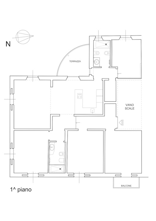 Questo arioso e luminoso appartamento è abitato da una giovane coppia e dalla loro piccola bambina. L’idea progettuale è partita dalla volontà di rileggere in chiave attuale l’originaria distribuzione planimetrica della casa assecondando i puntuali bisogni dei nuovi proprietari senza snaturare e cancellare i caratteri tipici dei palazzi del primo novecento fiorentino: ecco che a soluzioni moderne, sia nella scelta di alcune finiture che nell’arredo, si è voluto accostare scelte cromatiche e decorative originarie dell’epoca di costruzione. La casa è composta da un’ampia zona giorno con cucina a vista, intesa come centro virtuale della casa e cuore della vita domestica, da tre ampie camere servite da un bagno di pertinenza, mentre entrando nella zona di servizio troviamo un bagno per gli ospiti, un ripostiglio e una lavanderia. La cucina prende luce da una grande porta finestra che si affaccia su di una particolarissima terrazza a forma di quarto di cerchio. Da tutte le finestre si può godere della vista delle prime colline fiorentine e la natura che circonda la casa viene riproposta internamente nelle cromie a parete della zona giorno e nella scelta di pavimentare tutta la casa in parquet di rovere posato a spina ungherese o a plance a correre. I bagni si differenziano nelle finiture e nella scelta dei colori: quello padronale sui toni del grigio e del nero con una scenografica cabina doccia rivestita in lastre di grande dimensioni effetto marmo calacatta, mentre quello a servizio della zona giorno sul bianco e sul ferro arrugginito delle mattonelle in gres porcellanato del pavimento e del box doccia. L’attenta progettazione illuminotecnica ha creato soluzioni differenziate per i vari ambienti della casa. La sintonia e il confronto proficuo con la padrona di casa hanno permesso di consegnare una casa rinnovata senza rinnegare il passato ma con lo sguardo volto al futuro.Fotografo: Daniele Bianchi