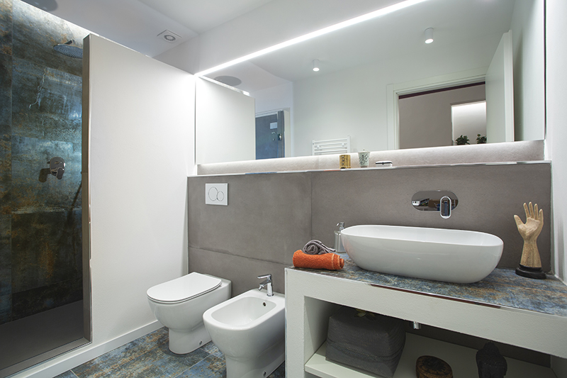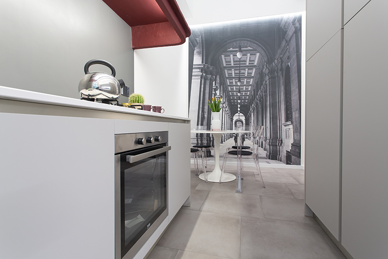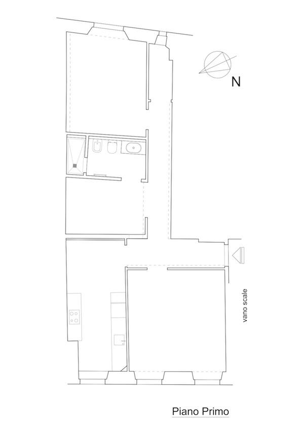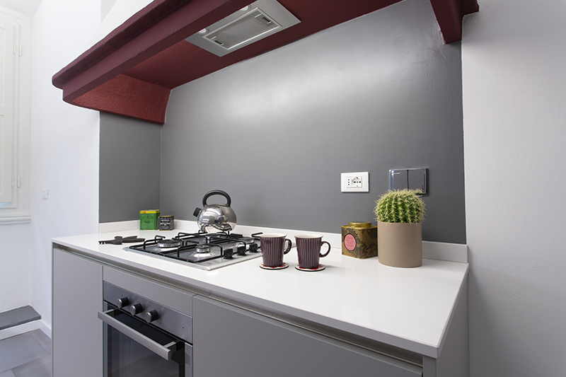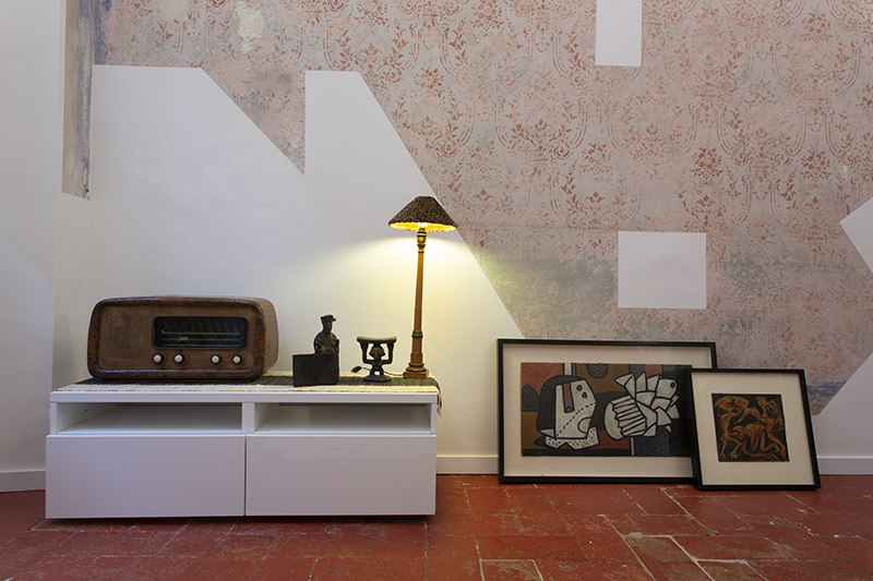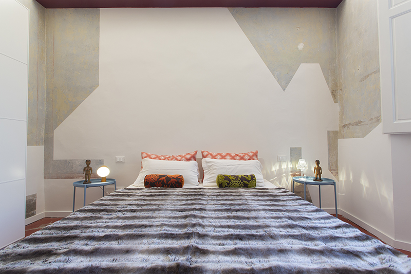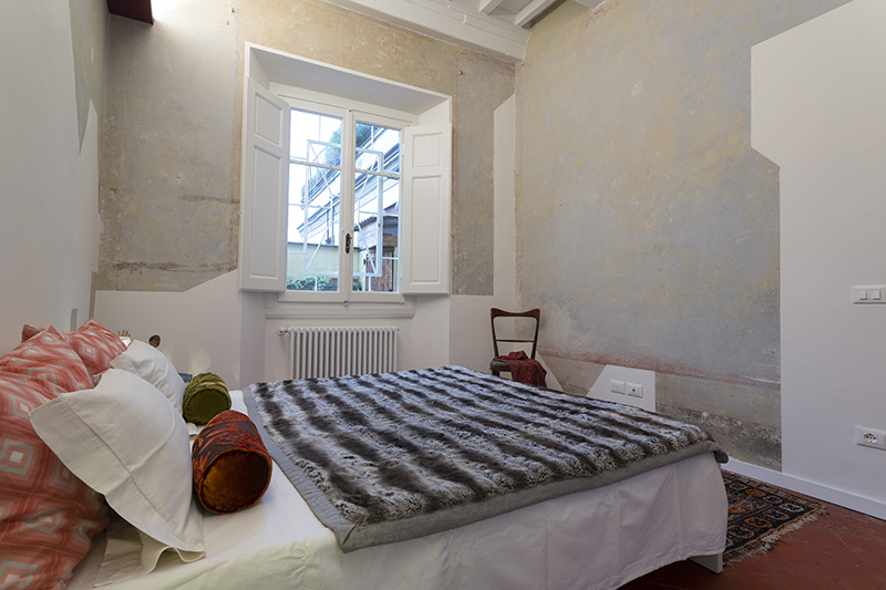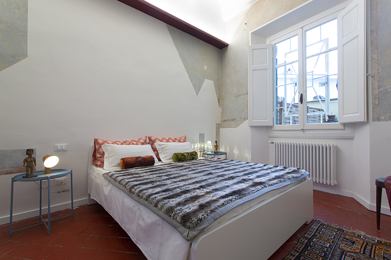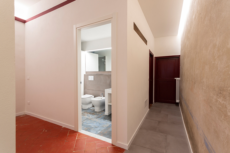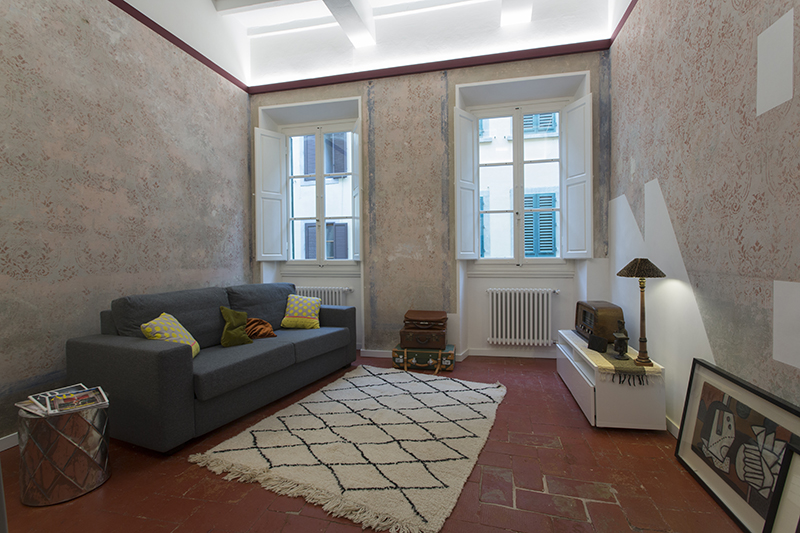 Questo delizioso appartamento sorge al piano primo di un bel palazzo nel centralissimo quartiere di Santa Croce. “Conce Rosse” è in onore dell’antico mestiere dei conciatori fiorentini che in questa zona avevano le loro officine e proprio la volontà di recuperare il passato ha definito il nostro progetto con un leitmotiv rosso che – declinato in molteplici soluzioni decorative – ritroviamo in ogni ambiente della casa. L’appartamento necessitava di un importante intervento di risanamento conservativo che permettesse il rinnovo delle dotazioni impiantistiche e delle finiture con la creazione di un nuovo servizio igienico nel pieno rispetto dei caratteri architettonici originali. Durante i lavori sono stati ritrovati degli antichi decori pittorici che sono stati recuperati e lasciati a vista. Analogamente sono state mantenute le pavimentazioni in cotto di alcune stanze intervenendo chirurgicamente con le dorsali impiantistiche al fine di preservare la “patina” del tempo. La distribuzione planimetrica è rimasta pressoché invariata: l’ingresso disimpegna il salotto con doppi affacci sulla strada e la cucina, mentre dal corridoio illuminato da un taglio di luce indiretta si accede al nuovo bagno e alla camera da letto che prende luce da una finestra sul fronte tergale. In cucina una gigantografia di Firenze fa’ da fondale alla zona pranzo e la sua prospettiva raddoppia la percezione visiva dello spazio regalandoci la piacevole sensazione di essere seduti sotto i portici di Piazza della Repubblica. Su tutte le pareti del salotto sono stati recuperati dei decori pittori a tema damascato sui toni del rosso, mentre il soffitto in legno è illuminato con un delle strip led dimmerabile. Il nuovo bagno gioca sui toni del grigio e del blu con una specchiatura extra-formato che dilata lo spazio.