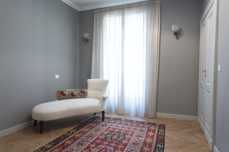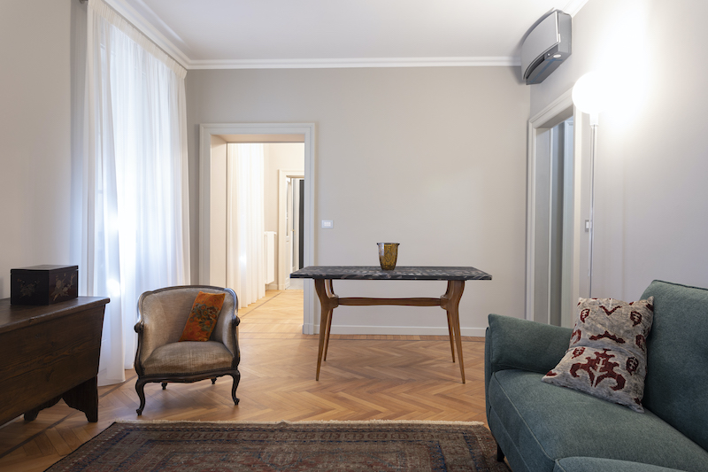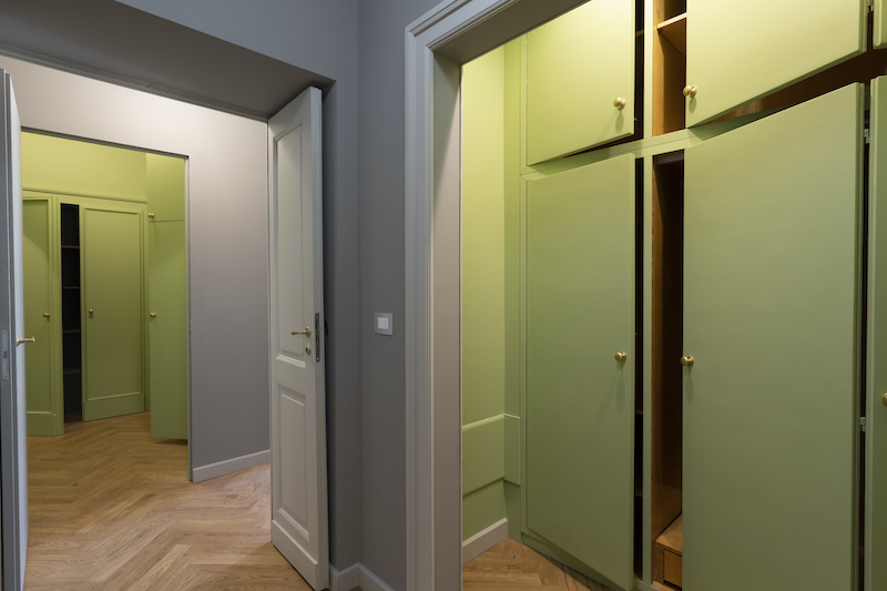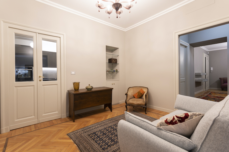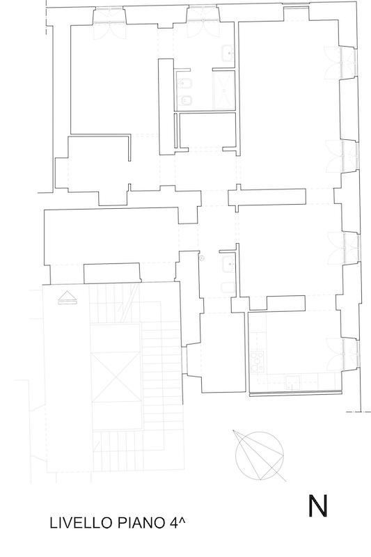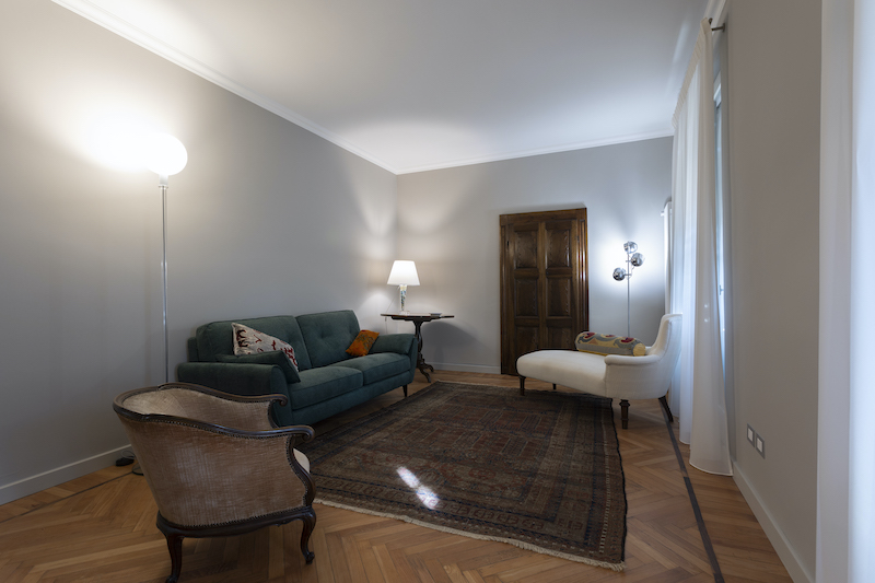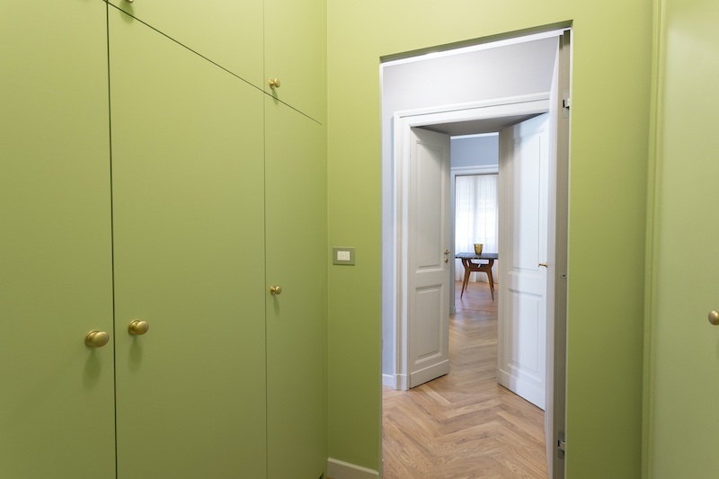 L’appartamento oggetto di intervento è posto all’ultimo piano di un immobile storico sottoposto a vincolo diretto della Sovrintendenza. Prima del nostro intervento di recupero, l’unità immobiliare versa in pessime condizioni di manutenzione sia dal punto di vista impiantistico che delle finiture. L’ipotesi progettuale ha assecondato i limiti stringenti imposti dal vincolo di tutela, volti a salvaguardare gli elementi architettonici originari, e su di essi si è incardinato il nostro intervento mediante l’attento restauro di tutti i serramenti esterni ed interni oltre al recupero delle pavimentazioni in parquet. La completa riqualificazione impiantistica ed energetica ha permesso, grazie alla consulenza di professionisti specializzati, di poter beneficiare delle recentissime agevolazioni fiscali del Superbonus 110%. La committenza desiderava preservare i caratteri tipici delle residenze torinesi e proprio da queste volontà siamo partiti con un intervento conservativo che attraverso puntuali innesti e minime modifiche ha permesso di soddisfare le mutate esigenze dalla nova proprietà. La distribuzione planimetrica permette di separare la zona giorno – composta da cucina, soggiorno e sala da pranzo – dalla zona notte caratterizzata da un’ampia camera da letto con bagno “en suite” e cabina armadi – oltre ad un bagno per gli ospiti e una zona di servizio. Le vecchie pavimentazioni, prive di valore e compromesse da precedenti interventi, sono state sostituite con un nuovo pavimento in parquet montato a spina italiana senza l’inserimento di fascia e bindello perimetrali, ma riletto in chiave moderna come elemento di continuità materica. Il nuovo bagno è stato realizzato con un tappeto uniforme di resina che, intervallata da una boiserie in lastre di gres porcellanato di grande formato, continua a tutta altezza colorando anche il soffitto di un blu profondo.Fotografo: Daniele Bianchi